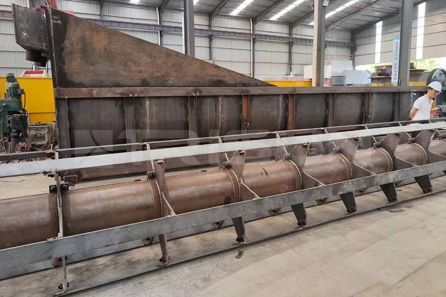 1) Washing principle. When the waterwheel sand washer is working, the motor provides power to the waterwheel to rotate, and the reducer decelerates the waterwheel so that the waterwheel rotates slowly. The sand first enter the tank and are driven by the waterwheel to tumble. At this time, water comes in and can take away the impurities. The qualified sand is discharged from the overflow opening of the washing tank. Spiral sand washers are generally placed at an angle. The spiral blades drive the sand upwards, and the water pipes supply water. The washed fine sand and soil flow to the sedimentation tank below with the water flow, and the clean sand is discharged from the discharge port above.